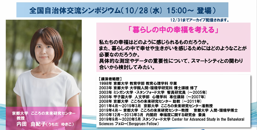 また、各取組みに関連し、月尾博士によるスマートシティセミナー「ポストコロナ時代の幸福社会」(10月27日(火)13:10~)、内田教授による全国自治体交流シンポジウム「暮らしの中の幸福を考える」(10月28日(水) 15:00~)も予定しております。【講演プログラムはコチラ】